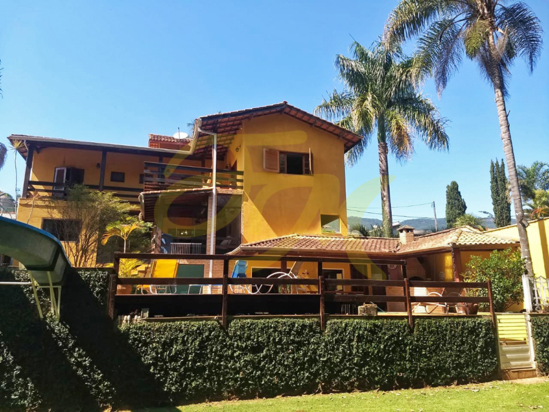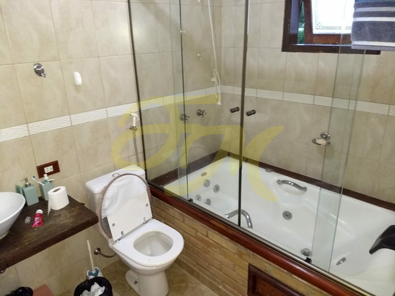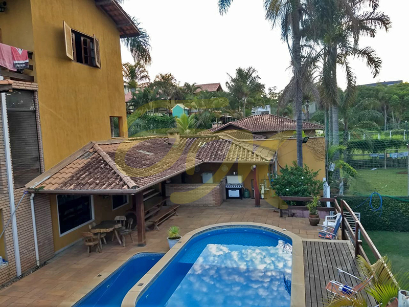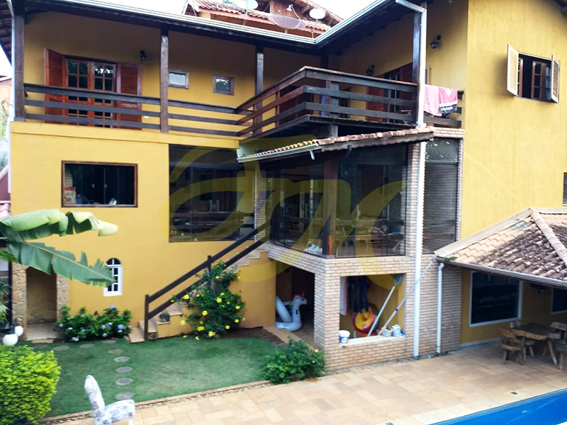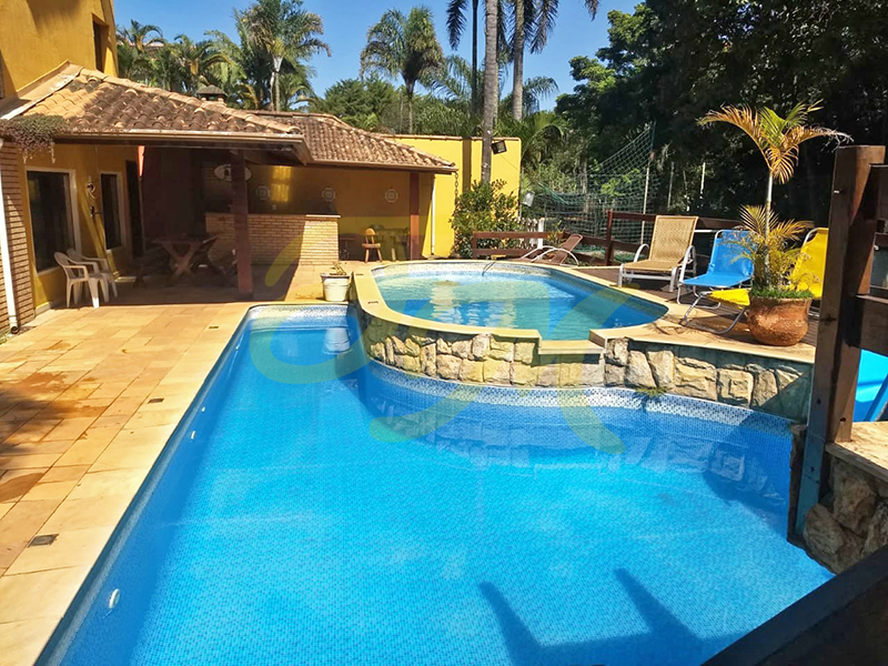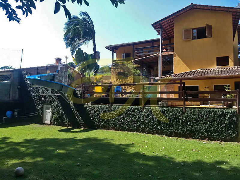 Sobrado em Condomínio Fechado (Recanto das Águas), com 05 suítes, 06 banheiros, 02 salas, lareira, salão de jogos, sauna, forno de pizza, fogão a lenha, 02 churrasqueiras, academia, 02 piscinas com toboágua, cascata e aquecedor, campo de futebol, bosque com árvores frutíferas e rio Jaguari no fundo do terreno.