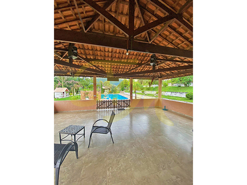 Um amplo salão de festas de aproximadamente 100,00 m². Linda vista panorâmica, piscina e área de churrasqueira, 2 lagos de pesca, área toda gramada. |