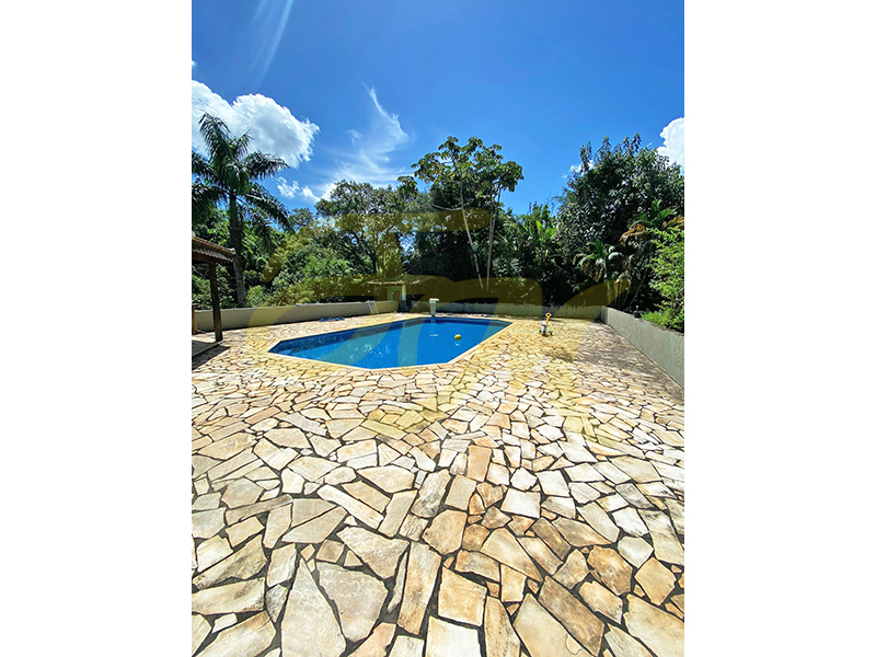Área de piscina com quiosque e ampla área gramada, fundo para o rio Jaguary.
