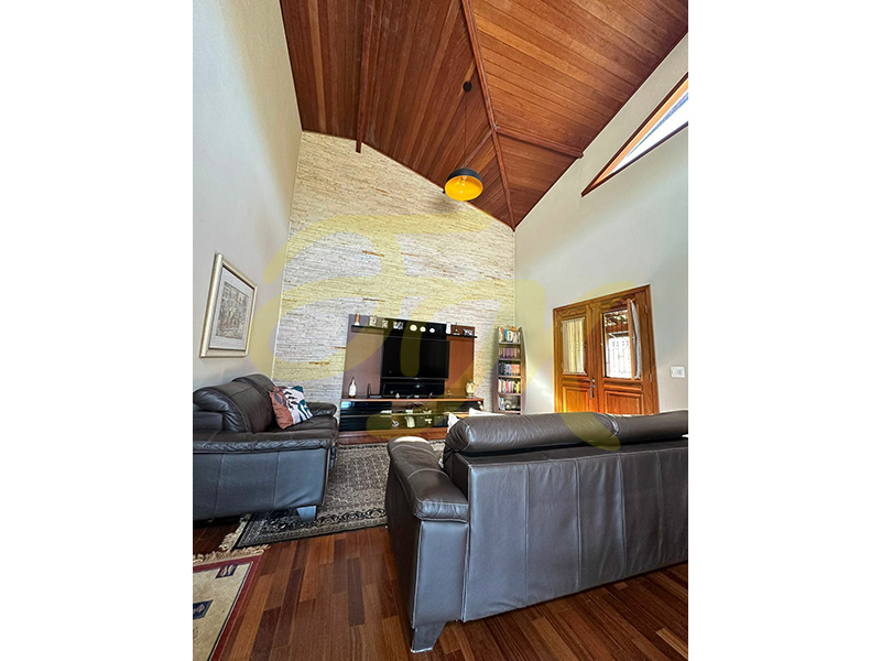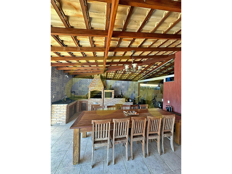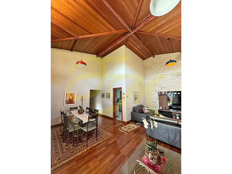 Casa composta por 3 dormitórios, sendo uma suíte, sala de estar e de jantar conjugadas - com pé-direito duplo e lindo acabamento em madeira, área gourmet com piscina e churrasqueira. |